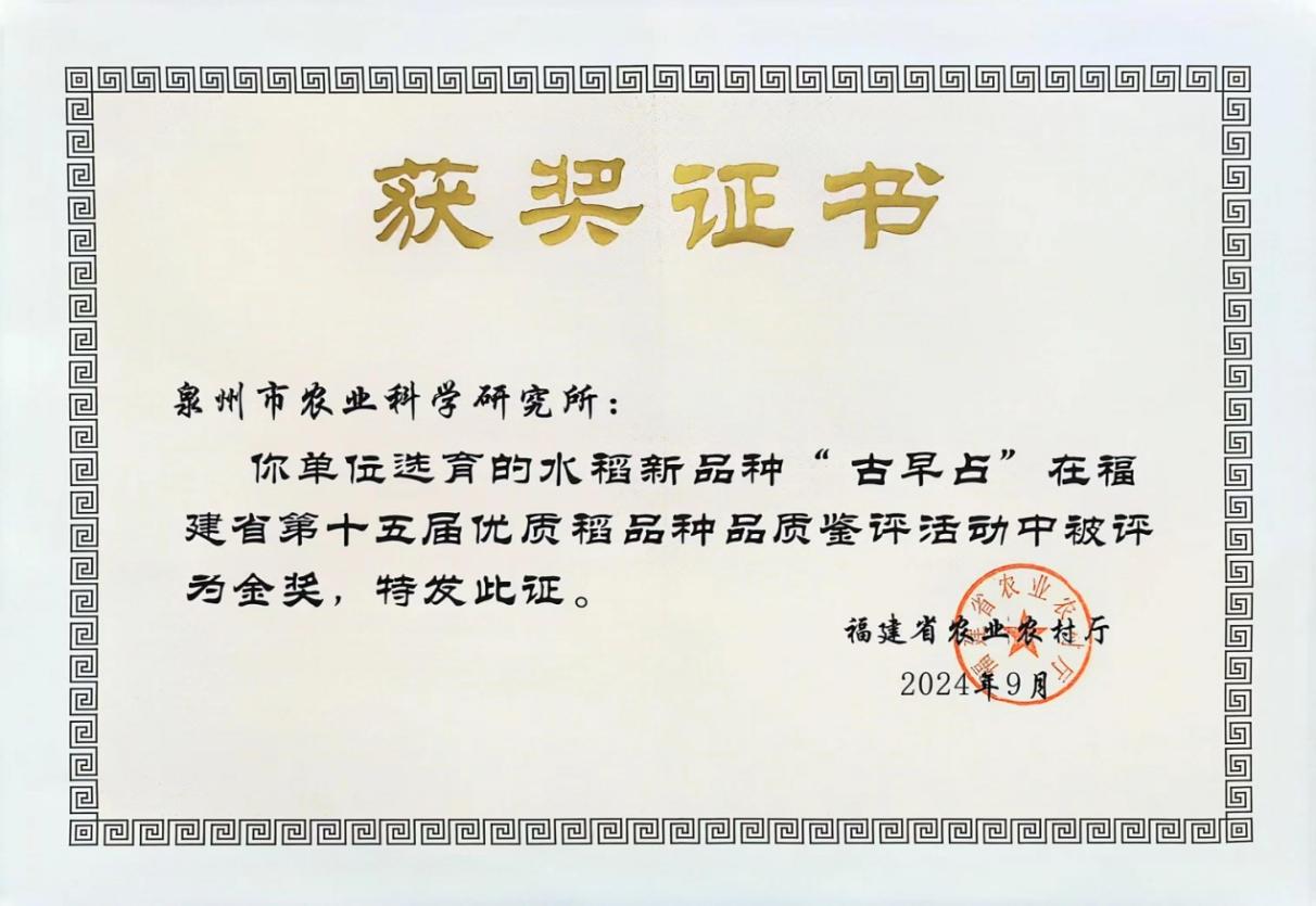 9月26日,福建省农业农村厅在三明市沙县区举办福建省第十五届优质稻品种品质现场鉴评活动。本次参评品种共27个(含对照),均为历届获奖且已经通过福建省审定的品种。泉州市农科所选育的优质常规水稻新品种“古早占”再次荣获金奖。“古早占”是市农科所选育的优质水稻新品种,该品种具有群体整齐,有效穗多,剑叶挺直,结实率高,熟期转色好等优点,其米质达部颁优质一等米标准,适合在我市作中稻种植。2019年,在福建省第十届优质稻品种品质鉴评活动中获后备品种组金奖。2023年通过福建省审定,审定编号:闽审稻20230024。2024年通过国家植物新品种保护,品种权号CNA20201007766。